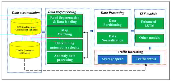 Figure 1 illustrates our weekday traffic conditions forecasting framework. Initially, GPS tracking data and traffic geometry are gathered. These inputs then undergo data preprocessing, including road segmentation, map matching, velocity determination, and anomaly handling. Following this, data processing involves partitioning and normalization. Subsequently, TSF models, such as enhanced LSTM and other suggested models, are created. Finally, integrating traffic geometry and TSF models enables the generation of accurate traffic forecasting about future traffic conditions.
