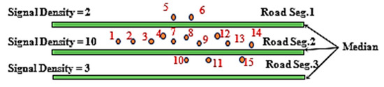 The accuracy of the vehicle’s location through GPS signals directly affects the results of calculating the average speed of each segment of the multilane road. Therefore, in addition to using accurate traffic geometry data from the 1/2000 scale map during the map matching stage, it is also vital to process which lane the GPS signal is located on. We described this incident in Figure 2 shown above. A registered vehicle moving on road segment 2 (Road Seg.2) transmits 15 GPS signals, which are red dots numbered from 1 to 15, in 15 min to the signal recording and processing center. However, 5 of the 15 received signals are not on Road Seg.2. There are 2 signals in Road Seg.1 (signals 5 and 6) and 3 on Road Seg.3 (signals 10,11). Road Seg.1 and Road Seg.3 could belong to the opposite direction in multilane road. This greatly affects the results of calculating the average speed of road segments and incorrectly determines the traffic status of each road segment and road network.