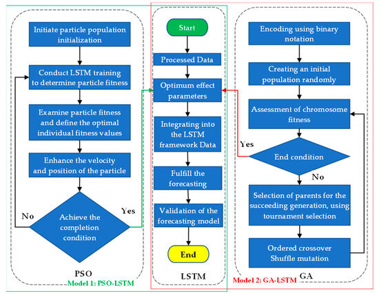 PSO-enhanced LSTM employs binary encoding, weighting vectors, velocity limits, and MSE as fitness functions to efficiently optimize parameters. The GA-enhanced LSTM utilizes binary encoding, a population size of 20, tournament selection, ordered crossover, and shuffle mutation to enhance model evolution and diversity within the population. These innovative approaches collectively improve forecasting capabilities by optimizing parameters and ensuring robustness in handling complex data. Details of the two models are described as follows.