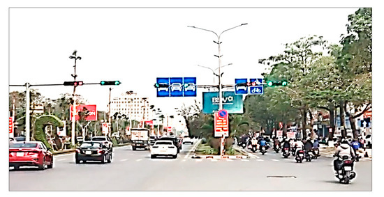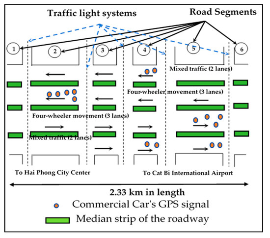 This figure showcases the distribution of commercial cars’ GPS signals along the roadway. This research analyzes 16 road sections along Le Hong Phong road, along with traffic light systems, offering valuable insights into traffic patterns and vehicle movement dynamics on this crucial road. Each part of the road is divided into many lanes, including two central lanes 10 m wide, divided into three lanes for cars (four-wheel vehicles), and two side lanes 7.5 m wide, divided into two lanes for both cars and motorbikes. In total, this research examines 16 road sections on the Le Hong Phong road (Figure 5).