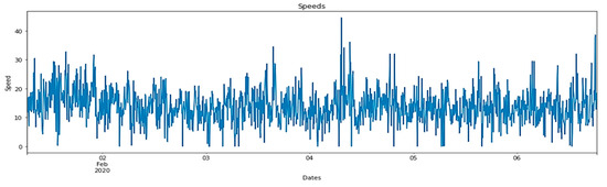 Furthermore, Figure 7 depicts speed values plotted against time. This visualization provides insights into how vehicle speeds fluctuate over time, aiding in the analysis of traffic patterns and dynamics. After processing the data, no unusual velocity values appear.