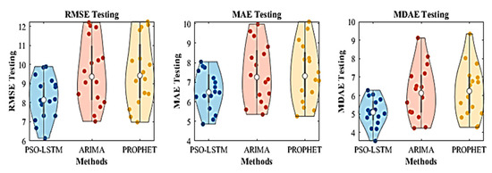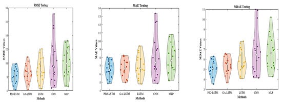 Based on the statistics from Table 4 and other statistical analyses, a violin chart was presented for a more objective comparison. The distribution of enhanced LSTM such as GA-LSTM and PSO-LSTM on the violin graph was uniform, narrow, and lower than graphs of other machine learning methods. Particularly, the median value of PSO-LSTM was always the smallest at 8.15, 6.49, and 5.10, with standard deviations (std) of 1.12, 0.99, and 0.75 for the RMSE, MAE, and MDAE indices.