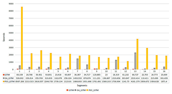 Figure 10 shows the runtime of three algorithms on sixteen experimental road segments. Upon observing the chart, it becomes evident that the runtime of the optimal algorithm LSTM using PSO and GA takes much longer than LSTM. This is understandable because, while LSTM fits directly with randomly initialized parameters on the training datasets, GA-LSTM and PSO-LSTM have to undergo an evolutionary process of GA and a movement iteration process of particles in PSO to find the optimal parameter set for LSTM. Another noticeable point is that the runtime of PSO significantly surpasses GA. Because of the GA technique, only a few offsprings need to calculate fitness values at each generation. Meanwhile, in PSO, at each movement iteration, all the particles need to update their positions and velocities, thus all having to recalculate fitness values. This leads to PSO having the longest runtime. This tradeoff can be acceptable because both PSO-LSTM and GA-LSTM yield better results than LSTM alone, and PSO-LSTM provides the best result.
