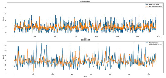 Figure 11 shows the TSF results of PSO-LSTM on Seg.1 of Le Hong Phong Street, depicting real train data and test data alongside the PSO-LSTM forecasting values. The above image showcases real train data (blue zigzag line) and PSO-LSTM predictions (orange zigzag line) for Seg.1 of Le Hong Phong Street. Similarly, the below image displays real test data and PSO-LSTM forecasting values. These visualizations offer insights into the accuracy of PSO-LSTM in forecasting vehicle speeds on this road segment.