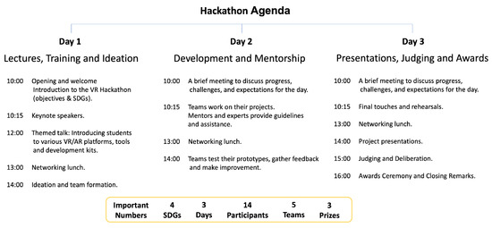 The final day of the hackathon saw teams putting the finishing touches on their projects and rehearsing their presentations. After a networking lunch, teams presented their VR/AR experiences to the judges and audience, who evaluated projects based on innovation, impact, relevance to the selected SDGs, and technical achievement. The event concluded with an awards ceremony, where winning teams were recognised for their exceptional work. Figure 2 demonstrates the VR hackathon agenda during the three days.