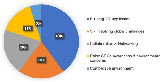 According to the survey of participants during the registration, the majority, 40%, took part in the hackathon to learn about using VR technology and building an application. In addition, 20% of the students were interested in using virtual reality in solving global challenges, while 15% were interested in spreading awareness and environmental concerns to people. Figure 4 demonstrates students’ approaches to participating in the hackathon.