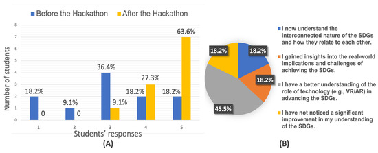 When asking the participants to select the best option that describes how their understanding of the SDGs has improved as a result of the hackathon, the majority of the students, 45.5%, selected that they had a better understanding of the role of technology (e.g., VR/AR) in advancing the SDGs. Figure 5B shows the results of the participants for this question.