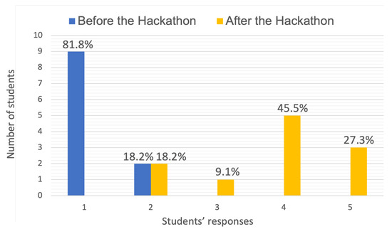 Also, most of the participants (72.7%) rated 5 as strongly agree with the statement: “The Hackathon significantly improved my ability to use VR/AR technologies”. Interestingly, only one participant selected 1 as strongly disagreed with this statement.