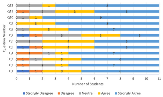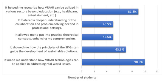 When asking the participants to rate the extent to which the practical assignments, such as project development and presentations, accurately represent scenarios they might encounter in real-world engineering contexts, 27.3% rated 5 as an extremely accurate rate, while ratings 3 and 4 had the same percentage of participants (36.4%). The participants also were required to rate the effectiveness of the authentic assessments in measuring their understanding of the SDGs and their ability to apply VR/AR technologies: 54.4% of the participants rated 4 “Very Effective” and 45.5% rated 5 “Extremely Effective”, while 45.5% strongly agreed with the statement: “The assessments provided valuable feedback on my learning progress”, and 18.2% selected 4 as they agreed with the statement, while 27.3% rated 3 as neither agree nor disagree.
