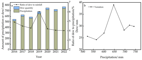 | Year | Dew Amount/mm | Precipitation/mm | Dew Days/d | Dew Frequency/% | Light Dew 0–0.2 mm | Heavy Dew >0.2 mm | ||