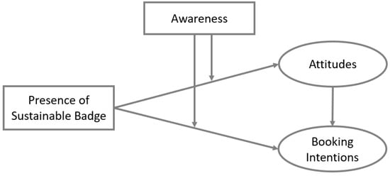 At the same time, guests’ awareness of sustainable practices can also moderate the relationship between the presence of sustainable hotel badges and guests’ attitudes and booking intentions. Awareness was found to interact with different factors influencing people’s attitudes in different consumption settings [38,39,40]. Therefore, it is reasonable to suggest that guests who have some knowledge about the hotel’s sustainable practices have better attitudes and are more likely to book a room at a hotel with a sustainable hotel badge than guests who are not aware of the hotel’s sustainability practices. In order to better understand the effects of guests’ awareness of Booking.com’s sustainable practices and sustainable hotel certification program on the relationships between the presence of a sustainable hotel badge and guests’ attitudes towards a hotel and booking intentions, this study hypothesized that: