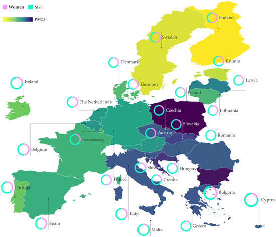 Percentage of women holding positions as members of ministries and PM2.5 levels in the EU-27. Please note that the PM2.5 data are for 2020, while the women’s representation data are for 2021. This graphic was generated using information from OECD data [37] and the European Institute for Gender Equality (EIGE) [38].