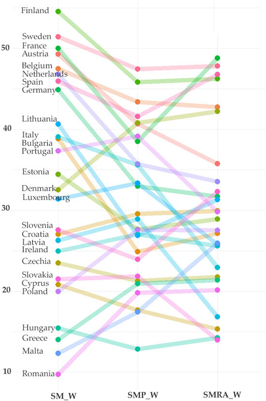 The representation of women in leadership roles in the EU-27 in 2021, categorized by leadership levels. Notes: SM_W indicates representation as ministers, SMP_W indicates representation as members of parliament, and SMRA_W indicates representation in regional assemblies. This visual was created using data from the European Institute for Gender Equality (EIGE) [38].