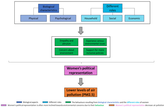 Considering the previous statements, women’s political participation can significantly and positively influence environmental quality. According to DiRienzo and Das [83], women are capable of fostering a pro-environmental agenda (known as the absolute effect), especially when included in influential positions overseeing resources [84]. This inclusion leads to policies that address their health needs and benefit the broader community. In other words, women, having perspectives and preferences different from men, can develop more inclusive policies that address the needs of those most affected by environmental challenges and even push forward advancements that improve economic development [85]. Moreover, increasing gender equality within the political system can help diminish health disparities by promoting higher levels of investment in essential infrastructure like cleaner air and water [84]. Figure 3 resumes the previously described theoretical framework.