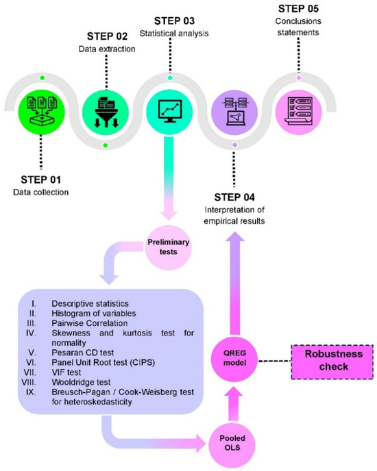 This section delves into the intricacies of the methodology, commencing with preliminary evaluations and culminating in applying both Pooled Ordinary Least Squares (OLS) and quantile regression (QREG) model regressions. Following the elucidation of the underlying theoretical framework, the subsequent phase systematically unveils the empirical research procedures to be executed with precision. The sequential progression of the empirical inquiry, outlined in Figure 4 below, serves as a strategic guide for translating theoretical underpinnings into actionable applications. These methodical steps are thoughtfully devised to bridge the gap between abstract concepts and the acquisition of tangible data, drawing concrete observations from real-world experiences.