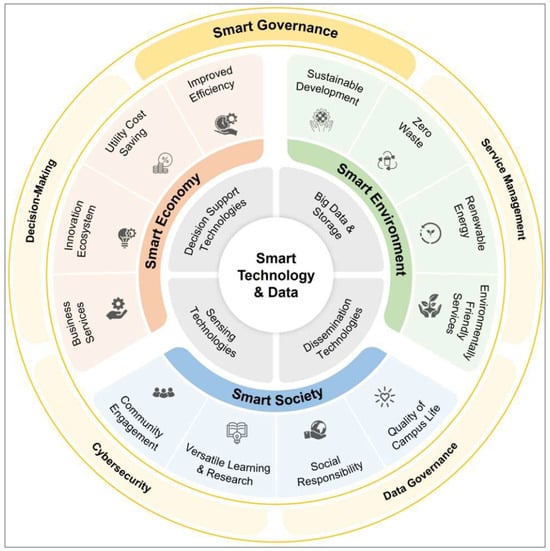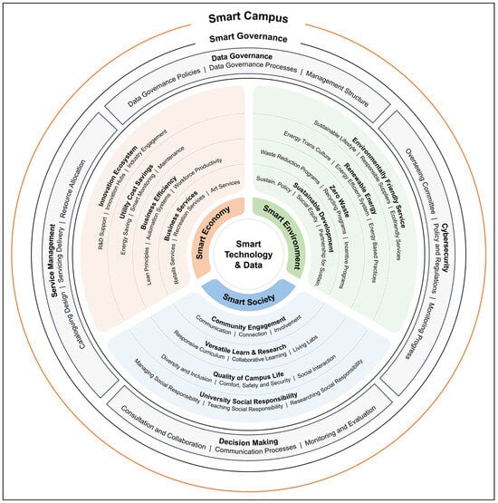 In response to the recent artificial intelligence (AI) revolution, higher education institutions have recognized the potential of AI-driven transformation to improve campus operations and enhance the learning experience. As a result, the concept of the ‘smart campus’ has emerged to address the impact of the disruptions driven by AI [1]. So far, a number of conceptual frameworks for the smart campus [1,2,3,4] have been proposed in terms of identifying its dimensions and the AI system. Among the early innovations is the framework in which Pagliaro et al. [5] highlighted the fields of action of smart campuses; driven by governance, management, information, and control. The dimensions included people and living, economy, environment, energy, and mobility.