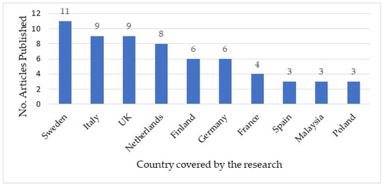 Figure 3 shows which countries have published the most results in terms of research on the application of sustainable innovation at the business, product, and service levels. Sweden leads in the generation of knowledge through the publication of research articles, while Italy and the United Kingdom present nine publications.