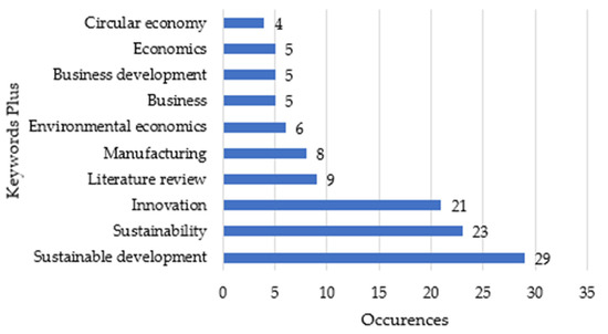 Figure 5, the word with the most occurrences is “sustainable development” with 29 repetitions in most of the articles analyzed, and in second place is “sustainability”. Now, it is worth highlighting that, for example, “circular economy” only had four occurrences, which indicates that, although it is true, the circular economy is a strategy for sustainable development (Almeida & Díaz [