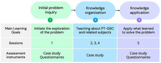 The procedural steps in this research are based on the three pedagogical moments (initial problem inquiry, knowledge organization, and knowledge application), describing the main learning goals, sessions, and assessment instruments.