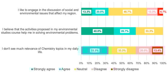 Figure 3 displays responses for items 4–6 (Appendix A). Learners were asked about their interest in discussing local social and environmental issues, showing a range of opinions. Additionally, they were queried about the effectiveness of activities in their environmental studies course, with approximately 40.0% strongly agreeing, 26.7% agreeing, and 33.3% being neutral. Another question explored the relevance of chemistry to daily life, revealing differing opinions on its practical importance.
