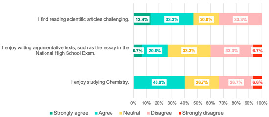 Figure 4 illustrates the responses for items 7–9 (Appendix A), investigating students’ perceptions of three key areas: reading scientific articles, writing argumentative texts, and studying chemistry. The results highlight the varied opinions among students. While some strongly agreed or agreed with reading scientific articles, others were neutral or disagreed. Similarly, opinions on writing argumentative texts, such as the essay in the National High School Exam for university admissions in Brazil, varied, with some enjoying it and others not. Regarding the study of chemistry, students’ opinions varied, with individuals expressing agreement, neutrality, or disagreement. Overall, the findings emphasize the diverse attitudes students maintain toward these academic activities.