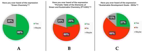 Responses to the closed-ended questions: (A) “Have you ever heard of the expression: Green Chemistry?”, (B) “Have you ever heard of the Periodic Table of the Elements of Green and Sustainable Chemistry (PT-GSC)?”, (C) “Have you ever heard of the expression: “Sustainable Development Goals—SDGs?”.