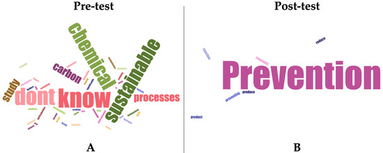 Figure 8 shows word clouds displaying the most repeated words in responses to the question “What is the first principle of Green Chemistry?” for both the pre-test and post-test. In the pre-test (Figure 8A), no students mentioned “prevention” in their response, and six scholars admittedly did not know the first principle of Green Chemistry. Some students had conceptual misunderstandings, such as prioritizing the study of plants or studying foods. For example, one student wrote: “Prioritize the study of plants, their chemical peculiarities”. Another learner, in turn, answered, “the use of natural products”. In the post-test (Figure 8B), the majority correctly answered the question, with “prevention” highlighted. Other terms in the word cloud resulted from longer responses. For example, one student emphasized prevention as taking measures to reduce damage. Only one student left the question blank in the post-test.