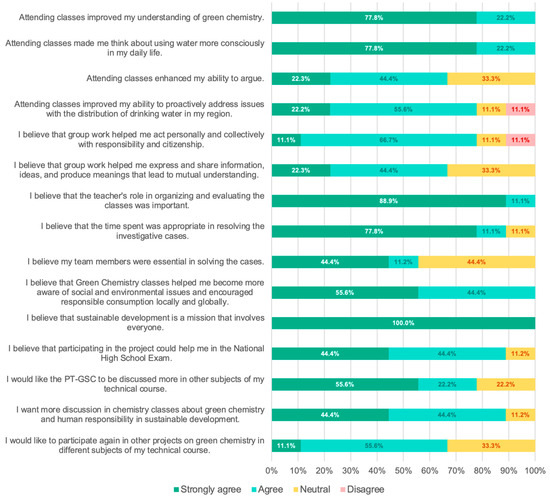 Figure 10 presents the responses for items 1–15 on a 5-point Likert scale in the final assessment (Appendix C). The analysis of students’ responses indicates positive outcomes from incorporating the PT-GSC in GSCE. For example, 77.8% strongly agreed, while 22.2% agreed that “Attending classes improved my understanding of Green Chemistry”. This alignment in percentages was also noted in the statement “Attending classes made me think about using water more consciously in my daily life”. Positive outcomes extended to group work, where students felt a sense of responsibility and citizenship. Recognizing the appropriateness of time spent on cases and the importance of team members contributed to a positive learning experience. Concerning “I believe that the teacher’s role in organizing and evaluating the classes was important”, 88.9% strongly agreed and 11.1% agreed.