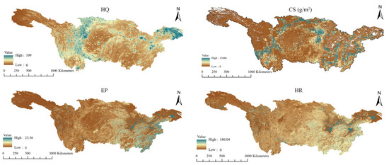 Maps of ecosystem service values in the Yangtze River Basin. Abbreviations: HQ—habitat quality, CS—carbon storage, EP—environmental purification, HR—hydrological regulation.