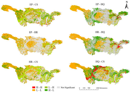 The overall performance of the Local Moran’s I map (Figure 3) showed a positive correlation between four ecosystem services occupying large areas in the YRB. Large regions of H-H agglomeration exclusively existed between the HQ and CS in the junction regions between the upstream and midstream areas of the YRB. H-H agglomeration areas of EP and HQ, and HR and HQ were mainly distributed in the lower reaches of the YRB. The synergies of H-L agglomeration were significant for all ecosystem services in the midstream of the YRB. EP and HQ, and HP and CS, presented a homologous distribution of L-L agglomeration, and this was also true for EP and CS, and for HR and CS. Prominent areas of L-H agglomeration could be observed in the upper-middle reaches and delta of the YRB.