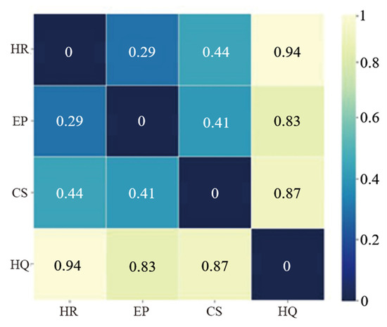 Correlation matrix of JSD between ecosystem services in the Yangtze River Basin. Abbreviations: JSD—Jensen–Shannon divergence, HQ—habitat quality, CS—carbon storage, EP—environmental purification, HR—hydrological regulation.