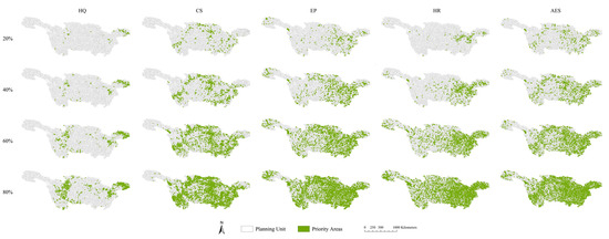 Setting targets for conserving each ecosystem service, the priority areas varied and were not the same under different target levels, which was particularly prominent at the target of 20%. As the target level increased, priority areas of CS, EP, and HR coincided. In contrast, nearly half of the HQ priority areas were not correlated with the other three ecosystem services, even if all of the planning units were selected (Figure 4). Only EP and HR showed a similar trend in the optimal spatial conservation pattern; these areas were concentrated in the east and at the source of the YRB (Figure 5). When conserving all of the ecosystem services, the priority areas were not merely an overlap of the results of optimizing each of the four ecosystem services; trade-offs were obvious between optimizing HR and optimizing all ecosystem services; and the JSD was 0.29, 0.44, 0.94 in order with EP, CS, and HQ (Figure 4). MARXAN tried to find the best solutions under the principles of representativeness and complementarity, and areas with high values of all of the target features have higher priority, so high-value areas with a single feature were not necessarily included. Another reason for this was that the HQ was distributed unevenly, so a small number of areas possessed much of the total amount. The same was true for CS, and the distribution for EP and HR was relatively uniform. Hence, their priority areas differed under a low target level but became more similar as the target level increased (Figure 4 and Figure 5).