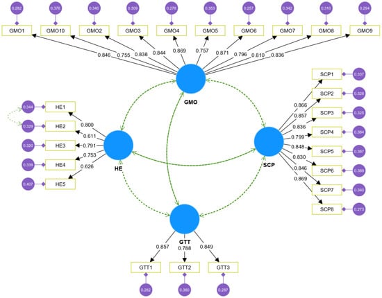 For validity, we employed convergent and discriminant validity. Fornell and Larcker [86] recommended that factor loadings for each item should be above 0.6, composite reliability (CR) should be 0.7 and average variance extracted (AVE) should be above 0.5 for convergent validity to be ensured. As illustrated in Table 2 and Figure 2, the factor loadings for all items were between 0.611 and 0.871. All variables’ CR was between 0.842 and 0.955. All variables’ AVEs were between 0.520 and 0.713. The results indicate that the variables exhibit acceptable levels of convergent validity. For discriminant validity, the results (Table 3) demonstrate that the square root of AVE of each variable was higher than the correlations with other surrounding correlations.