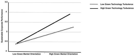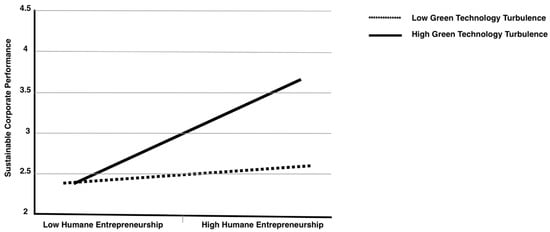Green technology turbulence relates to the speed at which the industrial environment or market undergoes changes, thereby reflecting the presence of uncertainty and potential risks associated with green technologies within the business environment [18]. Despite the positive effort by humane entrepreneurship toward sustainable corporate performance enhancements, some scholars (e.g., [12,60]) contend that the projected sustainable benefits are frequently met with high uncertainty under the conditions of technology turbulence. Specifically, green technology turbulence may enforce constant changes in how humane entrepreneurship practices are implemented, as a low or high influence of green technology turbulence on the implementation of humane entrepreneurship may have varying effects on sustainable corporate performance.