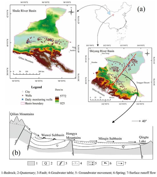 (a) Location of Hexi Corridor, and wells distribution of Shule River Basin (SLB) and Shiyang River Basin (SYB) and (b) hydrogeological section.