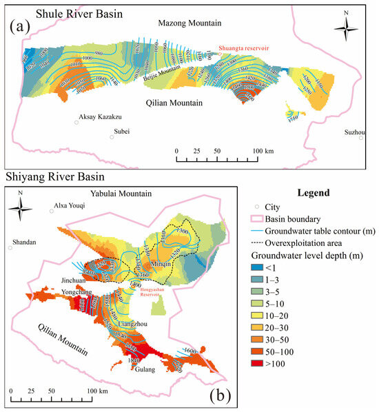 Spatial distribution of groundwater level depth (GWD) and contour in two major basins of the Hexi Corridor in March 2023. (a) The Shule River Basin (SLB), (b) the Shiyang River Basin (SYB).