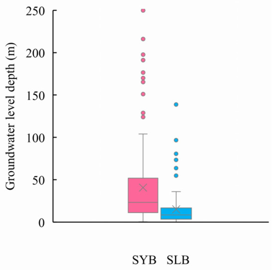 Box diagram of the groundwater level depth (GWD) in the Shiyang River Basin (SYB) and the Shule River Basin (SLB) of the Hexi Corridor. Boxes represent 25th, 50th, and 75th percentile values, and whiskers represent 10th and 90th percentile values. Scatter points represent extreme values.