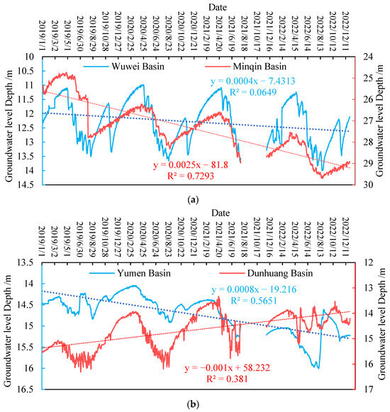 Daily variation of groundwater level depth in typical monitoring wells in the Hexi Corridor. (a) The Shiyang River Basin (SYB) and (b) the Shule River Basin (SLB).