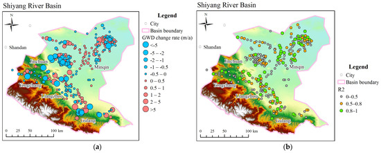 Distribution diagram of (a) groundwater level depth (GWD) change rate and (b) coefficient of determination (R2) in the Shiyang River Basin (SYB) from 2019 to 2023.