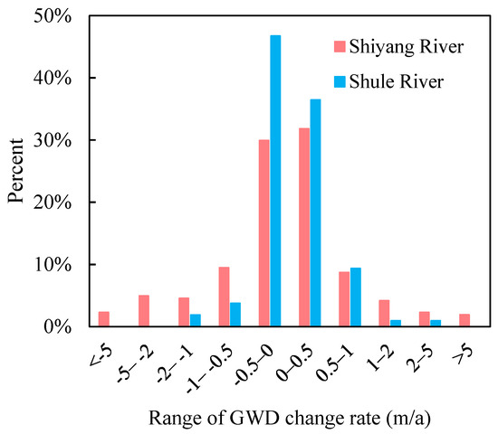 Statistical histogram of the change rate of groundwater level depth (GWD) in the Shiyang River Basin (SYB) and the Shule River Basin (SLB) of the Hexi Corridor.