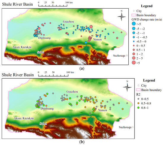 Distribution diagram of (a) groundwater level depth (GWD) change rate and (b) coefficient of determination (R2) in the Shule River Basin (SLB) from 2019 to 2023.