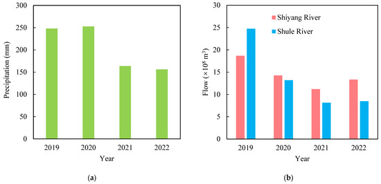 (a) Annual precipitation and (b) annual flow of rivers of the Hexi Corridor from 2019 to 2022.