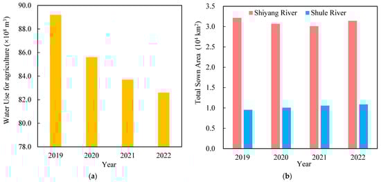 (a) Water use for agriculture and (b) total sown area in plain area of the Hexi Corridor from 2019 to 2022.