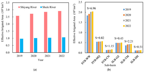Effective irrigated area in plain area of (a) the Hexi Corridor and (b) sub-basins from 2019 to 2022. S represents the growth rate of effective irrigation area (104 km2/a). Sub-basins include the Wuwei Basin (SYB-WW), the Minqin Basin (SYB-MQ), and the Changning Basin (SYB-CN) in the Shiyang River Basin (SYB), and the Guazhou Basin (SLB-GZ), the Yumen Basin (SLB-YM,) and the Dunhuang Basin (SLB-DH) in the Shule River Basin (SLB).