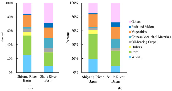 Sown area structure of major farm crops of the Hexi Corridor in (a) 2019, and (b) in 2021.