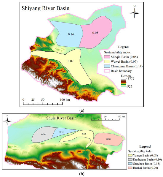 Groundwater sustainability index of (a) the Shiyang River Basin (SYB) and (b) the Shule River Basin (SLB).