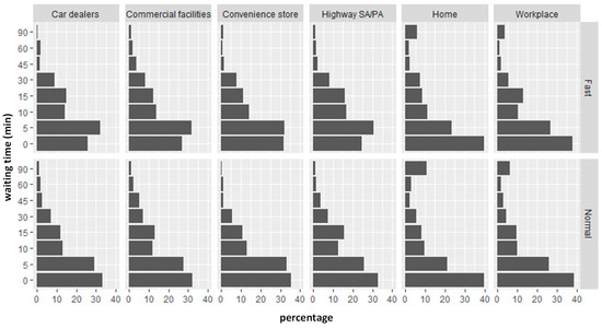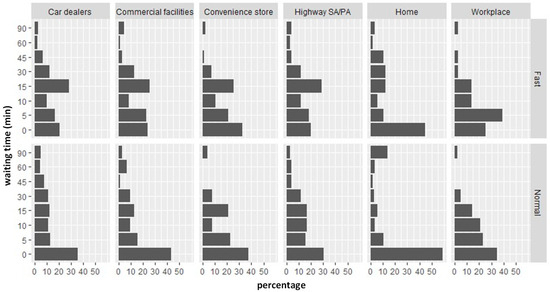 Figure 2 illustrates the distribution of the maximum waiting times reported by the respondents. The EV users reported longer waiting times for fast-charging facilities at car dealerships, commercial facilities, convenience stores, and highway SAs/PAs. Conversely, regarding workplace charging, the respondents indicated minimal waiting times, ranging from 5–15 min for fast charging. This can be attributed to the fact that at their workplace, EV users typically plug in their vehicles and leave them to charge while performing their work duties.