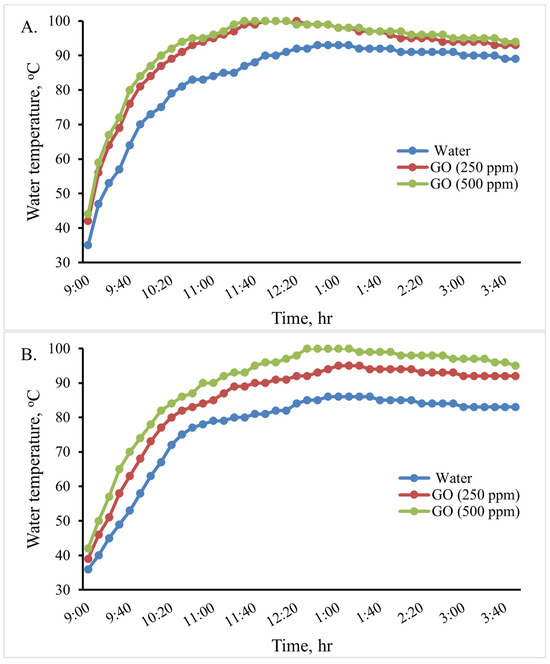 In this experiment, an indirect solar cooker was used to heat 0.5, 1.0, and 2 L of water. The water temperature variation in the cooker in the various scenarios is shown in Figure 10. When using 2 L, the maximum water temperature reached in the cooker was 81 °C at 1:10 Pm, 90 °C at 1:00 Pm, and 97 °C at 12:40 Pm for the base fluid water, GO (250 ppm)-water, and GO (500 ppm)-water, respectively. Therefore, when using the GO (500 ppm)-water nanofluid instead of water in the indirect solar cooker, the temperature of water increased by about 16 °C (19.75%). When using 1 L, the maximum water temperature reached in the cooker was 86 °C at 1 Pm and 94 °C at 1 Pm for the base fluid water and GO (250 ppm)-water, while water boiled at 12:40 Pm for GO (500 ppm)-water. When using 0.5 L, the maximum water temperature reached in the cooker was 93 °C at 12:50 for the base fluid water, while water boiled at 12:10 Pm and at 11:40 Pm for GO (250 ppm)-water and GO (500 ppm)-water, respectively. The thermal performance of the GO (500 ppm)-water nanofluid can be considered good. Therefore, the GO (500 ppm)-water nanofluid could be used instead of water in the solar cooker to boil water; so, the rice cooking operations were carried out using it.