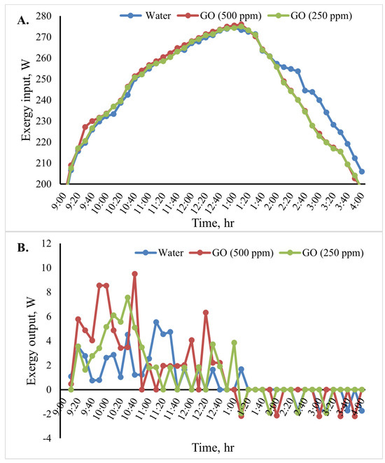 Figure 12 shows the cooking unit’s input, output, efficiency, and exergy change over time for the various heat transfer fluids. Based on the results shown in Figure 12B, throughout the test period, the cooking unit’s average output exergy was 5.5, 7.5, and 9.5 W for the heat transfer fluids water, GO (250 ppm)-water, and GO (500 ppm)-water, respectively. The average exergy efficiency of the cooking unit in the various scenarios over time is shown in Figure 12C. The results of the analyses show that when using the nanofluids, the cooking unit’s average output and exergy efficiency were higher than those of the water-based system. The average exergy efficiency of the cooking unit in the system with the GO (500 ppm)-water nanofluid was 3.1%, as shown in Figure 12. Furthermore, the average exergy efficiency for water was found to be roughly 2.1%.