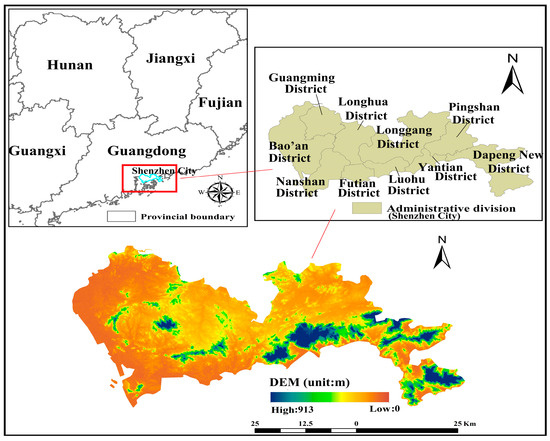 Shenzhen City (113°45′~114°37′ E, 22°26′~22°51′ N) is located to the south of the Tropic of Cancer, in the southern coastal area of China, with low terrain in the northwest and high in the southeast (the average elevation is about 80 m), and is one of the four central cities in the Guangdong–Hong Kong–Macao Greater Bay Area (Figure 1). The land area of the study area is approximately 1997.47 km2, of which approximately 1005.95 km2 is built up, accounting for approximately 50.36% of the city; meanwhile, the topography of the area is low in the northwest and high in the southeast. In the continuous development and construction of urbanization in the study area, urban green space has been increasingly eroded, fragmentation is serious, and eco-environmental problems are becoming increasingly prominent, which seriously affects regional ESs [43].